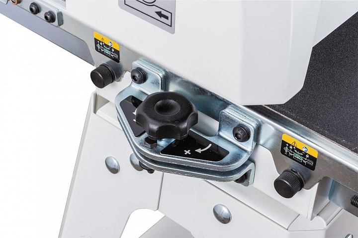 Высота над лентой транспортера регулируется вращением рукоятки, при этом можно контролировать как абсолютное значение по миллиметровой шкале на корпусе, так и относительное перемещение по лимбу на рукоятке. Регулировка параллельности вала и основания производится без вспомогательного инструмента: два фиксатора и винтовой упор оборудованы барашковыми рукоятками.