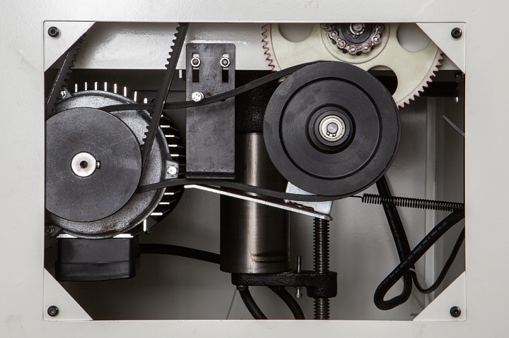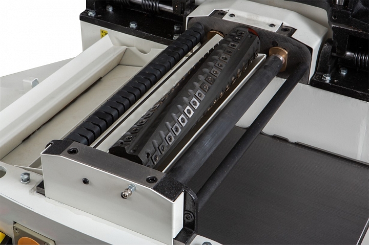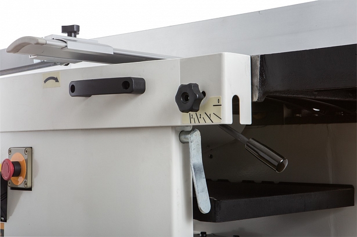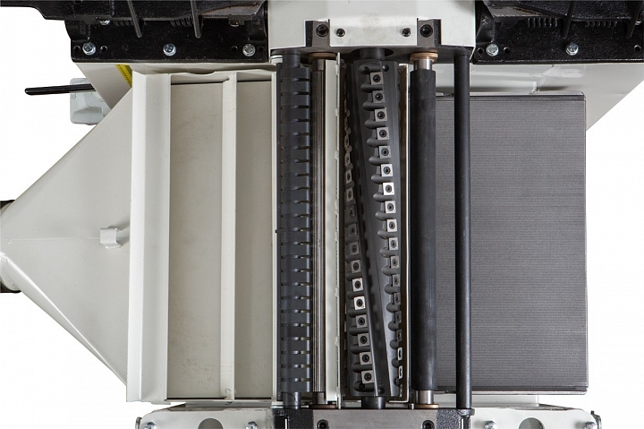 Конструкция станка – одна из самых удачных на рынке: широкое использование массивных чугунных деталей гарантирует точную работу без вибраций, при рейсмусовании верхний модуль целиком поднимается и не мешает ни работе, ни стружкоудалению, мощный трехфазный двигатель обеспечивает высокую производительность и надежность. Отдельного внимания заслуживает удобный эксцентриковый механизм регулировки положения столов, причем как подающего, так и принимающего, что необходимо при установке вала helical (опция).