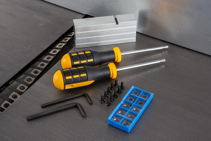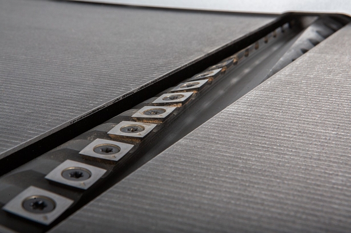 Входящий в базовое оснащение вал helical снабжен твердосплавными режущими вставками. Он надежнее и проще в эксплуатации (не нужно никаких регулировок), а за счет последовательного входа ножей в заготовку работает тише и с меньшими вибрациями.