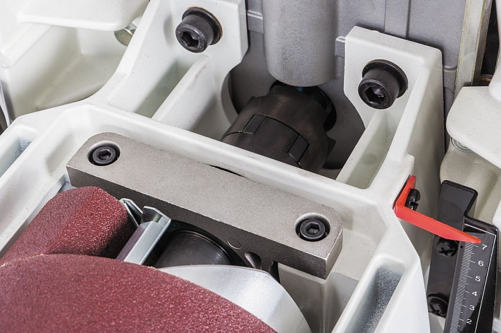 В штатном варианте поставки модель укомплектована алюминиевым барабаном с намоткой из абразивной ленты. Благодаря фирменной системе крепления её замена производится быстро и просто. Доступ к узлу освобождается после откидывания кожуха-пылесборника, концы фиксируются прижимами-защелками, натяжение производится специальным пружинным устройством, которое компенсирует вытягивание ленты в процессе износа.