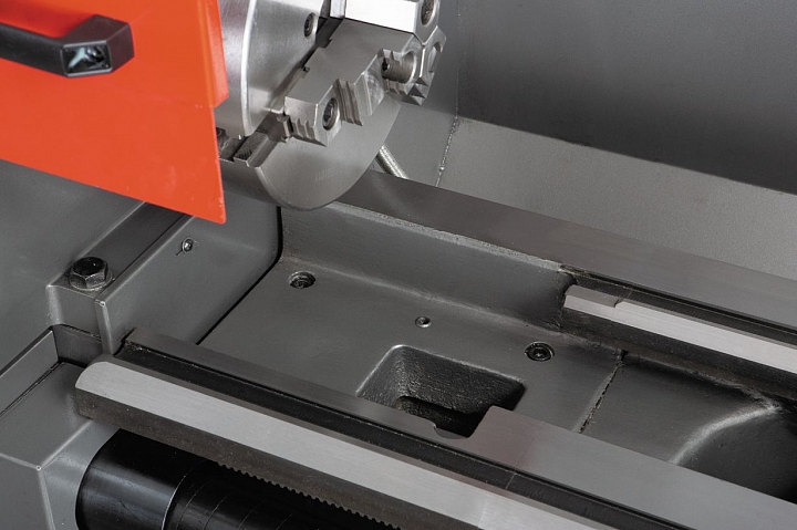 Конструктив GH-1640 ZX DRO имеет облегченное исполнение. Это достигается, прежде всего, за чет снижения металлоемкости станины, направляющие которой закаляются и шлифуются по фирменной технологии. Предусмотрена регулировка зазоров при помощи клиновых планок.