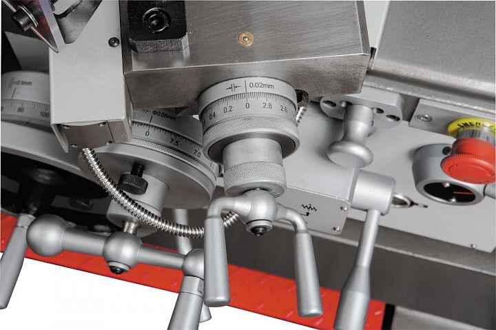 Коробка подач полностью автоматическая и позволяет нарезать все основные типы резьб без смены шестерен: метрические дюймовые, модульные и питчивые. GH-1640 ZX DRO может использовать широкий ассортимент резцов различного назначения, резцедержатель рассчитан на оснастку до 25x25 мм по сечению ее хвостовика. Станок поставляется с цифровыми линейками УЦИ (индекс «DRO») по трем осевым направлениям, что облегчает работу оператора, повышает точность обработки, экономит время и снижает риск возможного брака. GH-1640 ZX DRO оборудован регулируемой муфтой ходового винта и толчковым режимом пуска шпинделя для облегчения смены режимов работы.